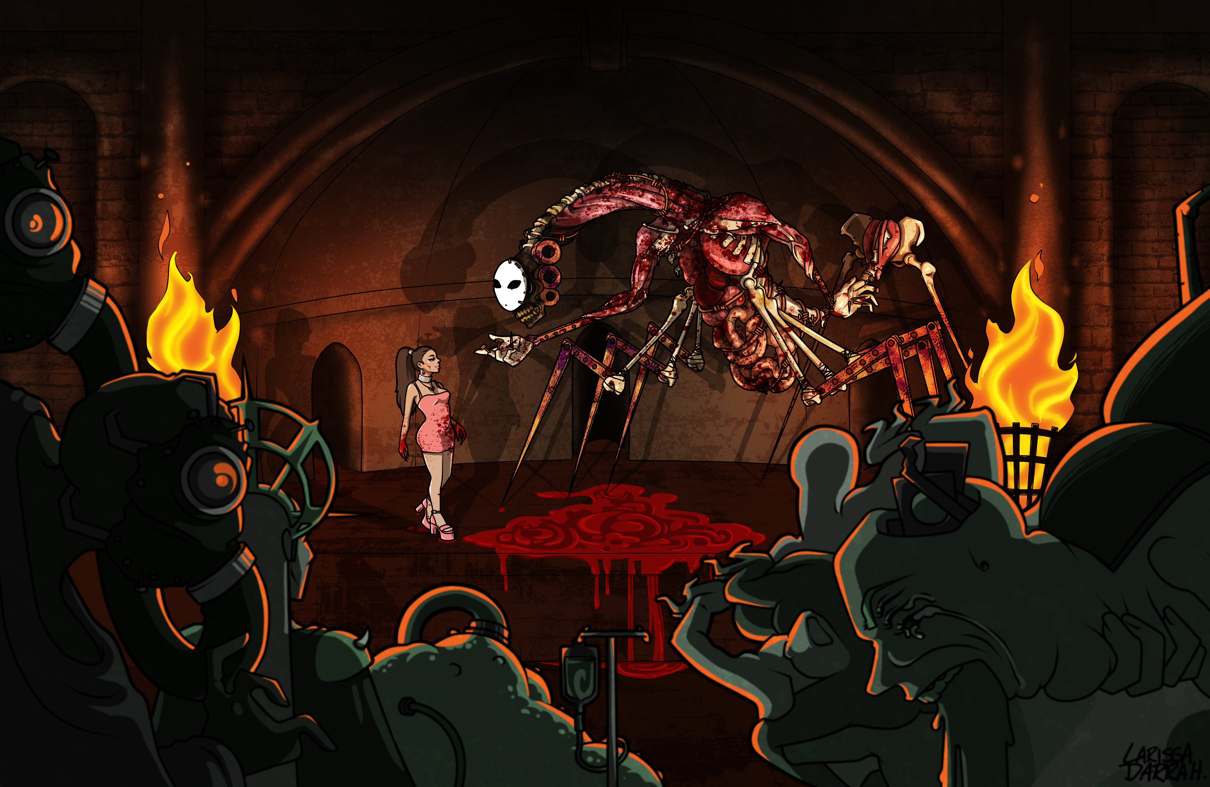 The ring burns hotter, a familiar feeling now, and Jessy chases the distant moan of pain when she digs deeper into Simon’s body. The sigil must be perfect, and it must be deep. The blood brings her closer, eats the light around them and darkens the room. The dark green tarp crumples up, like paper in a fire, twisting into burnt fractals before evaporating entirely. As the tarpaulin burns away, it reveals underneath a floor of polished stone, splattered with soot and blood. Jessy’s gaze remains on her willing victim whose wide-open, bloodshot eyes witness the room filling with heavy smoke. At first it feels as though the room has shrunk, but it is only the shadows creeping in and concealing the walls. The sigil is done, and Jessy briefly admires its beauty before putting her blade aside and looking around her. The large fires burning in bronze braziers provide more smoke than light and make it hard to breathe. At the edge of her vision, the flickering flames reveal rows upon rows of seats in front of her, rising upwards. She and Simon are on a stage, a theater dedicated to her bloody deed. The crowd is sparse, but it is there, concealed by darkness. Someone in the back is hunched over, blood and bile pouring out of their ruined mouth in a steady stream down the aisle. A beautiful woman dressed in a regal gray gown has her still, icy eyes on Jessy, vivisected chest proudly displaying her ribcage and the steaming organs underneath. Three men stand as one, bound together with their arms and legs clearly broken to fit the shape they have been forced into. Everywhere she looks, Jessy sees only mutilation. Simon is screaming and huffing and struggling against the sacred pain, but those who have joined them seem unaffected by their own plight, more interested in his. Have they come for him or her?