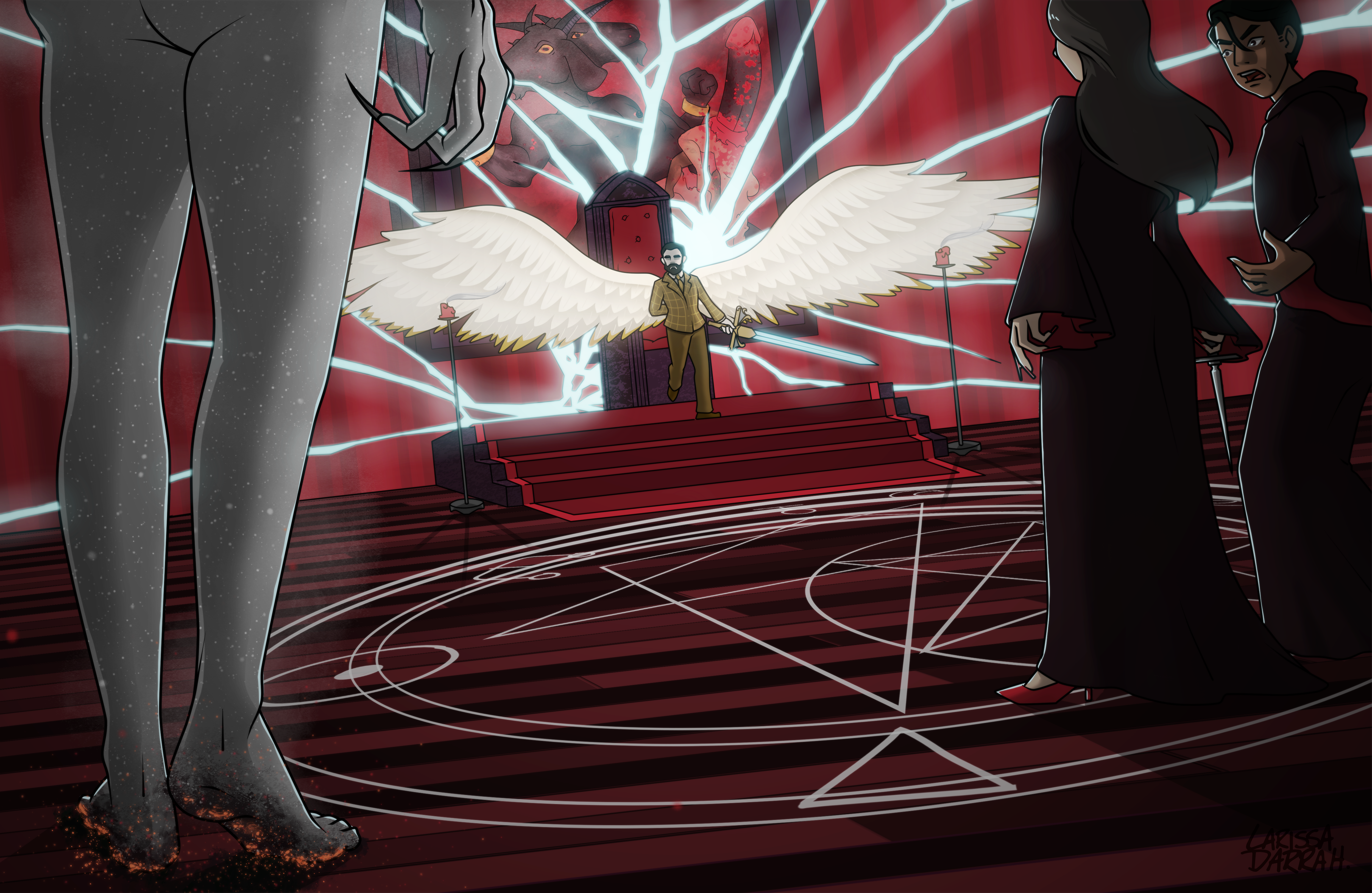 | Tan yells for her, tries to get close. His eyes meet Jessy’s, he sees the lines Jessy is carving into Karim’s back, and something clicks6. She made this happen. He screams about Golachab, about Artyom, about how Jessy betrayed them all. Rather than fighting him, Jessy continues to stab her only way to safety. If she could bring Artyom there, or take herself to him, she might survive7. Tan rushes forward, but his assault is cut short by Sol’s sword, a single slash causing a wall of white fire to burst out of the floor to separate Tan and Jessy. Her ring is burning hot, its distant screaming filling Jessy’s mind and soul. Something is still wrong. The sigil isn’t good enough, and Sol’s fury is coming down on her in a second. The point of his sword is at her face, and through her tears all she can see are blurred shapes of white, blue and gold. Somewhere distant, the police monster Ellis O’Donovan has beaten down the door to their ceremony to round up everyone in the room. As all thought collapses into a singular point of fear and failure, Jessy discovers in her a memory from before she was born8. Angela knows a way out, and from her incessant whispers in the back of Jessy’s mind, she is keen on taking it. Sol’s sword is raised high above her, she will either do as Angela wants or she will die. She sinks the stiletto deep into Karim one last time, his entire back a red ruin, and allows for the moment that Angela take control of everything. Jessy detaches from the world and watches from afar as Tan in his rage pounces through the divine fire to come at her. Robe aflame, he crashes into Jessy. They tumble, but not onto the floor. Sol’s sword bears down on nothing, Tan saving Jessy’s life but falling with her and Angela into darkness. |