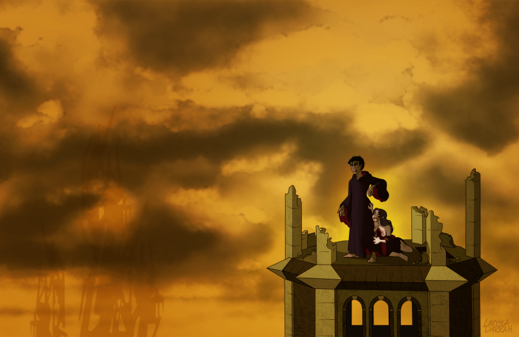 The ring makes people bad, Jessy tries to explain to Tan. Her mother told her as much. He seems uninterested in listening more to her. He will put up with her, but not entertain her madness. She thinks out loud, hoping for Tan to bite, wondering what would happen if someone who was already bad used the ring. Tan curtly responds that good and bad are not valuable concepts by which to measure people, though when Jessy mumbles about herself being a bad person, he doesn’t disagree with her. Tan prefers to see the world through power and weakness, knowledge and ignorance, truth and falsehood. He cannot fault Jessy for acting how she did, she believed it to be in her best interests. Jessy agrees. She really did think that she was doing the right thing for herself. Tan wastes no time mocking her efforts, still angry with Jessy and eager to scorn her for thoughtlessly bowing to the demons of Golachab the Torturer. Willingly. Does she not realize that is what she’s done? Tan could have given her so much, yet she chose to be a slave. The barbed wire necklace, invisible to everyone but Jessy, still tears at her throat. She’s gotten used to the pain. Jessy cowers pathetically and admits that she doesn’t even understand everything Tan’s saying. He pities her, but she doesn’t want pity, she wants guidance. Tan knows so much, and she thought she knew better than him but she doesn’t. Up until today Jessy was so sure that Tan had it wrong, but she admits to him that she wants his truth. She wants to follow him, really listen this time. Tan only scoffs. It is far too late for that. He ignores Jessy’s sobbing, marching ahead with a determined scowl. The two follow what they think is the sound of music, but the tune dissipates into nothing. Headless corpses sit comfortably on the sides of the street, cross-legged and with their hands folded in prayer, surrounded by chewed bones and rusted swords and daggers. Footsteps nearby. A procession, at most a few streets away. They approach with care, coming upon another extravagant and bombed out plaza like the one in front of Dehu and Mil’s temple. One end of the open space is entirely dominated by a massive building, somewhat like a cathedral with its impressive columns and single tower reaching up towards the black Sun. Much of it is collapsed, the same ruin seen across the city having also befallen this place, but its gaping entrance, crude and defaced gargoyles, and one of its many spires remain intact. Standing on the steps of this monument to gods forgotten are a small crowd. Jessy watches from a distance and tries to stop Tan from approaching. She senses the danger, but he is undeterred and asks if she still has the knife she stole from him. Their only weapon.