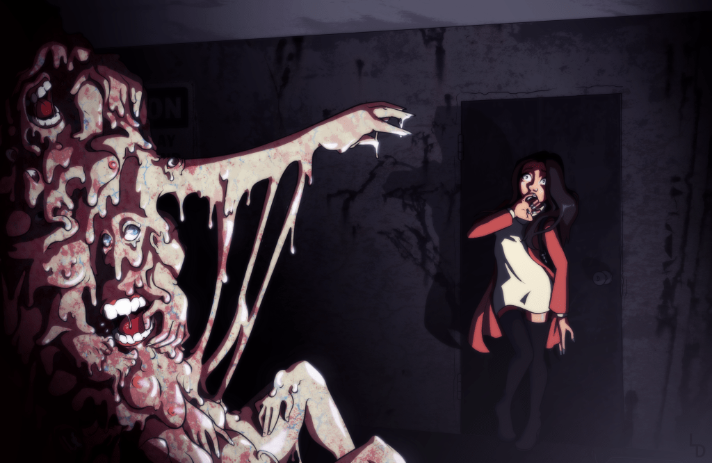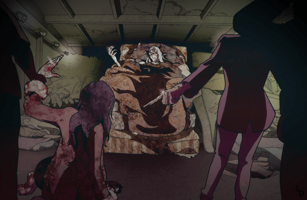 Jessy’s Story is the biggest art project I’ve ever done in my life and I’m so grateful for the love and support I had from my partner, in both life and this project, without him I don’t think I could have finished all of this. He kept me propped up when I was too hard on myself, as most artists end up being. Through this project, I’ve been able to grow exponentially in my art practice. I started Jessy’s story illustrations with mostly a visual concept, highly stylized and dramatic, like the character Jessy herself, while also trying to keep the dark and edgy nature of Kult. I learned the digital cell shading style that I used in college, and even the textures throughout the illustrations in Jessy’s were assets from one of my professors!