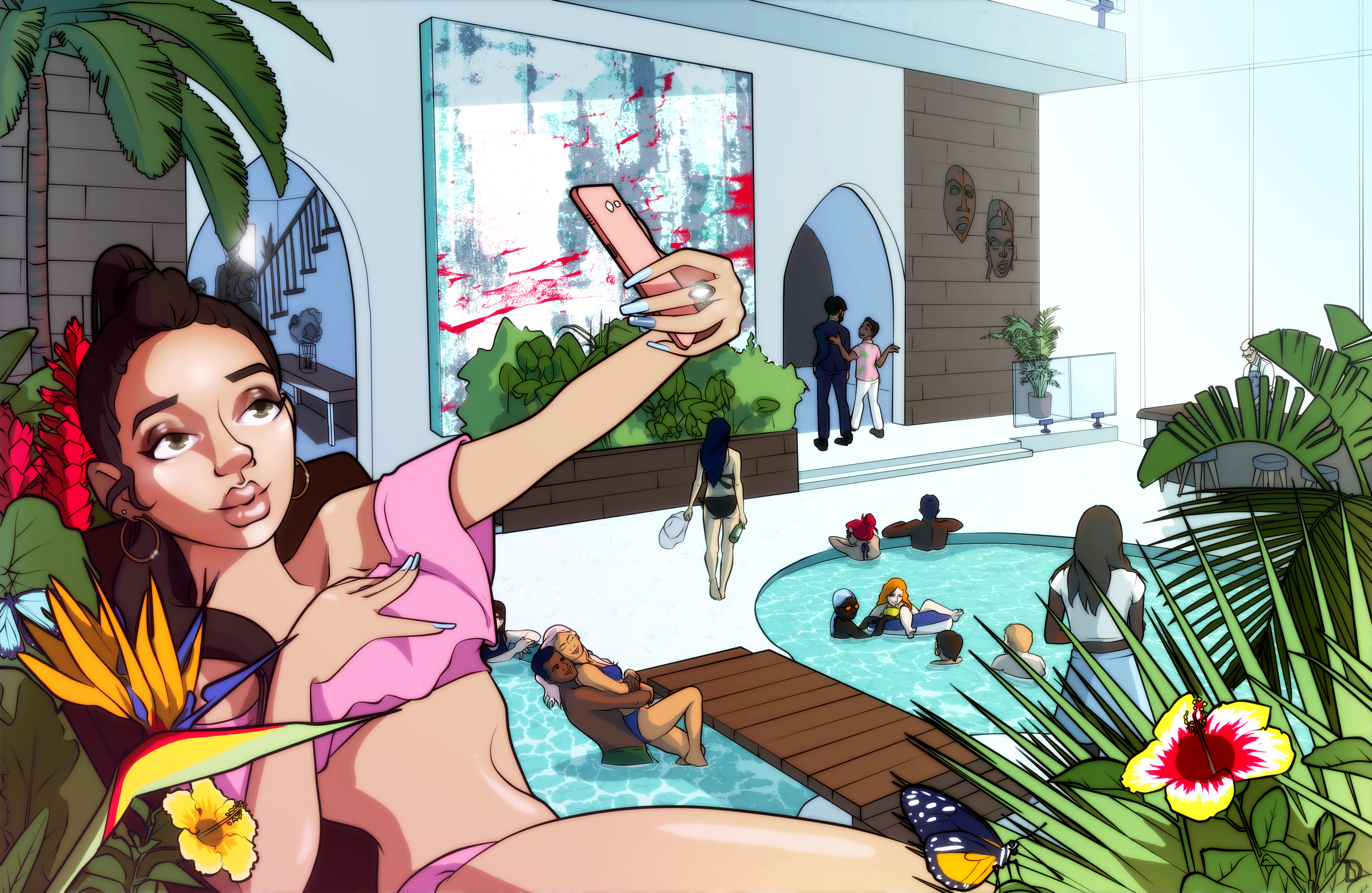 I first took those ideas, mostly the cell shading, into a redo of my Mental Illness Chic project in 2019, but I really developed it in this project. These illustrations in Jessy’s Story were so large and detailed and with so many layers that I think I can at least partially blame it for my graphics card starting to go out on my computer this year! Many of the pieces had to be split into a sketch file and a final illustration file because even the sketches had several layers. Jessy Story sketches, the more detailed ones, tended to be collages of photos I’d taken (thanks again goes to my husband for constantly being a model) and drawings I’d done in my sketchbook. I really loved using photos from an abandoned mining building I’d snuck into with my friends while we were teenagers for Wilma’s set pieces. Most of my other references, especially for Jessy’s wardrobe, came from images on my Pinterest moodboard for the project. Other than that, it was just hours and hours of pure drawing.